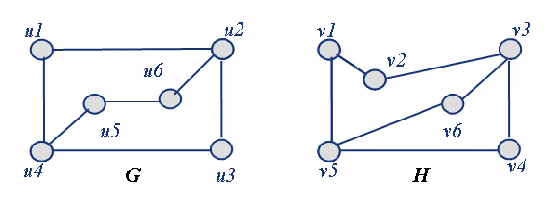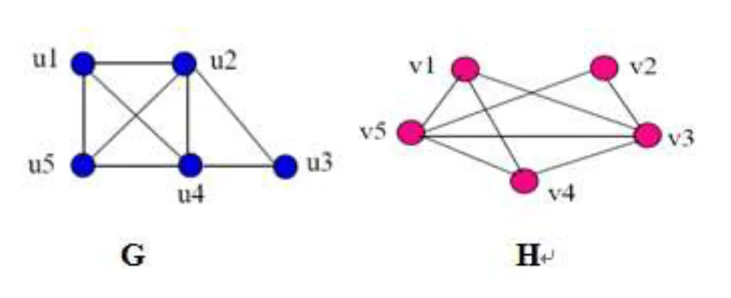 f(u3)=v2,f(u1)=v1,f(u5)=v4,f(u2)=v3,f(u4)=v5。因此,G 和 H 是同构的。