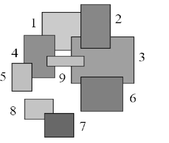 Consider the rectangles T={1,…,9} and the relation R such that i R j = “i is more distant than j from the viewer.” Then R is a partial order on the set of rectangles. Please show an order of topological sorting according to the following figure.