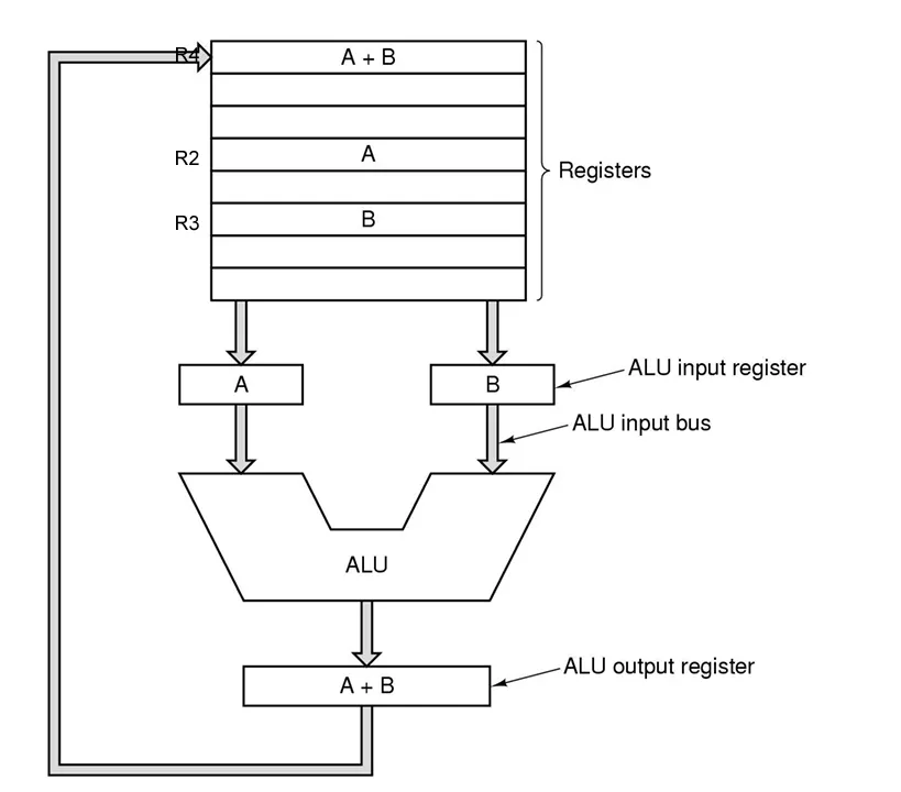 一般流程如下:将操作数载入到 memory 中,然后将题目载入到处理器中,在 ALU 中执行算术逻辑操作,然后将计算结果返回到 memory 中或者暂时保留在处理器中。