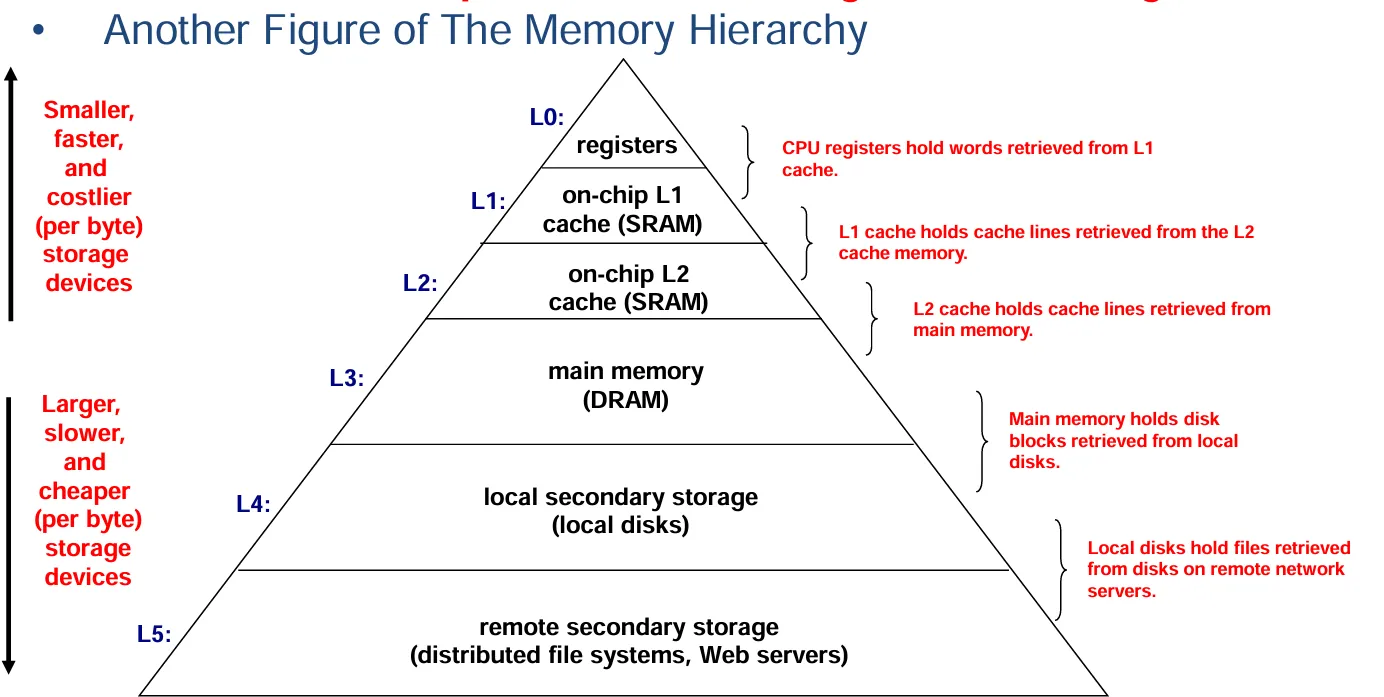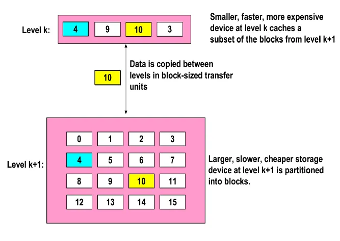 层级特性差异:正因为如此,层级 k + 1 的存储设备可以速度更慢些,相应地其每比特的成本也会更低,而且容量可以更大。