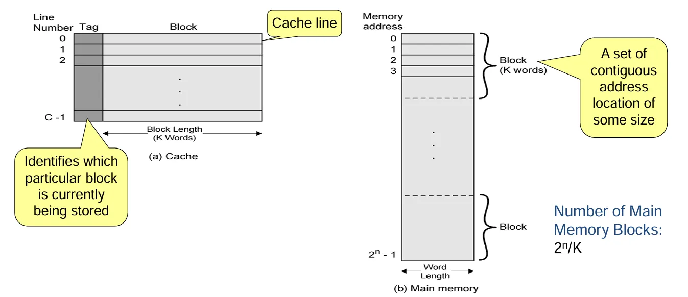 - 主存地址结构:主存地址由不同部分构成,其中最低有效 w 位用于标识唯一的字,而最高有效 s 位用来指定一个内存块。并且,最高有效 s 位又会被拆分成一个缓存行字段 r 位以及一个标记(tag)字段(共 s - r 位,且是最高有效部分)。