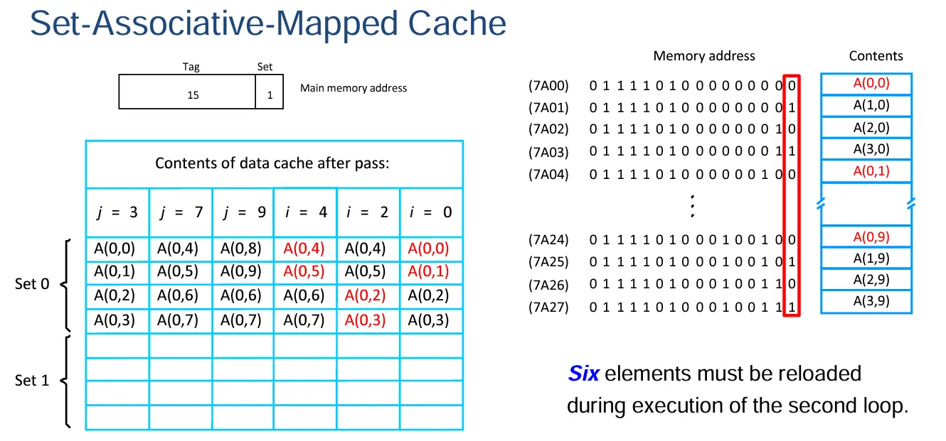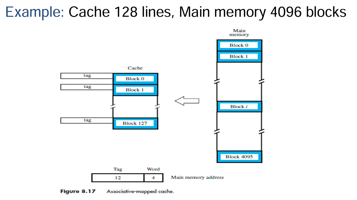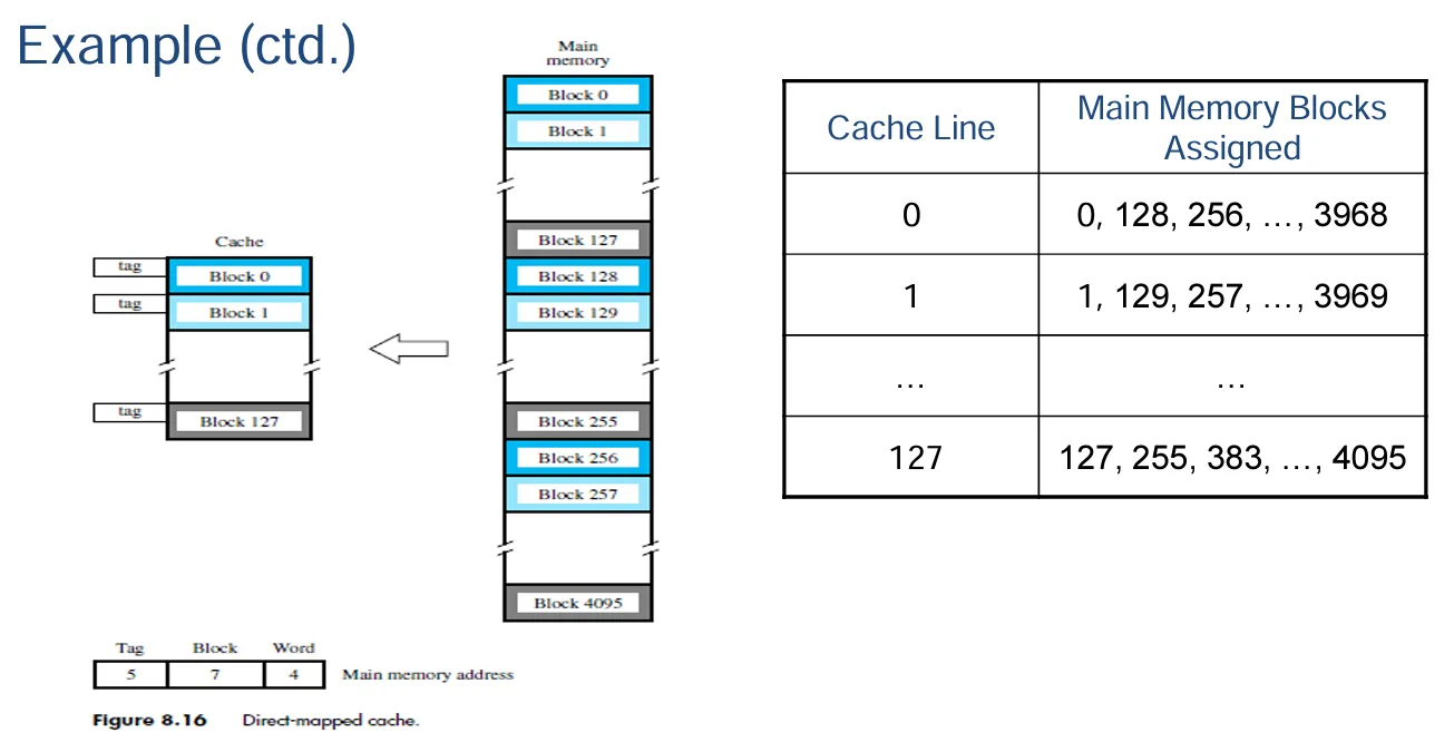 - 假设有一个高速缓存,它包含 128 个缓存行,每个缓存行有 16 个字。主存储器有 64K 个字,同时假设主存储器是通过 16 位地址进行寻址的,并且连续的地址指向连续的字。那么,总的主存储器块数量为 64K / 16 = 4K(也就是 4096 个),并且满足关系\(i = j \mod 128\)(即内存块序号 j 对缓存行数量 128 取模等于缓存行序号 i)。