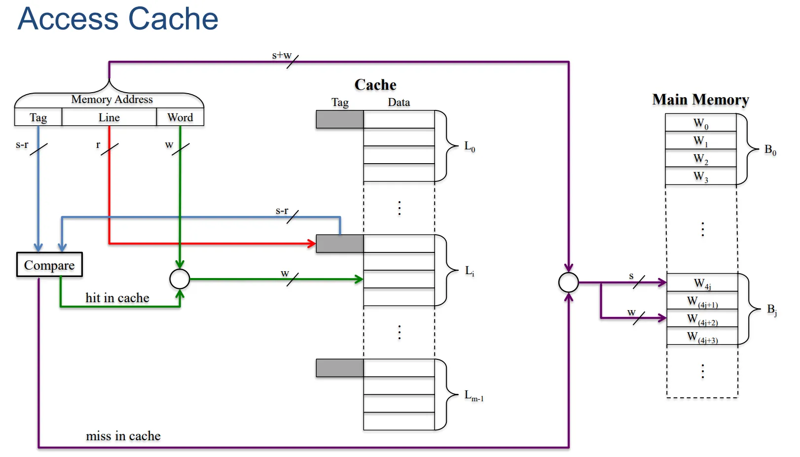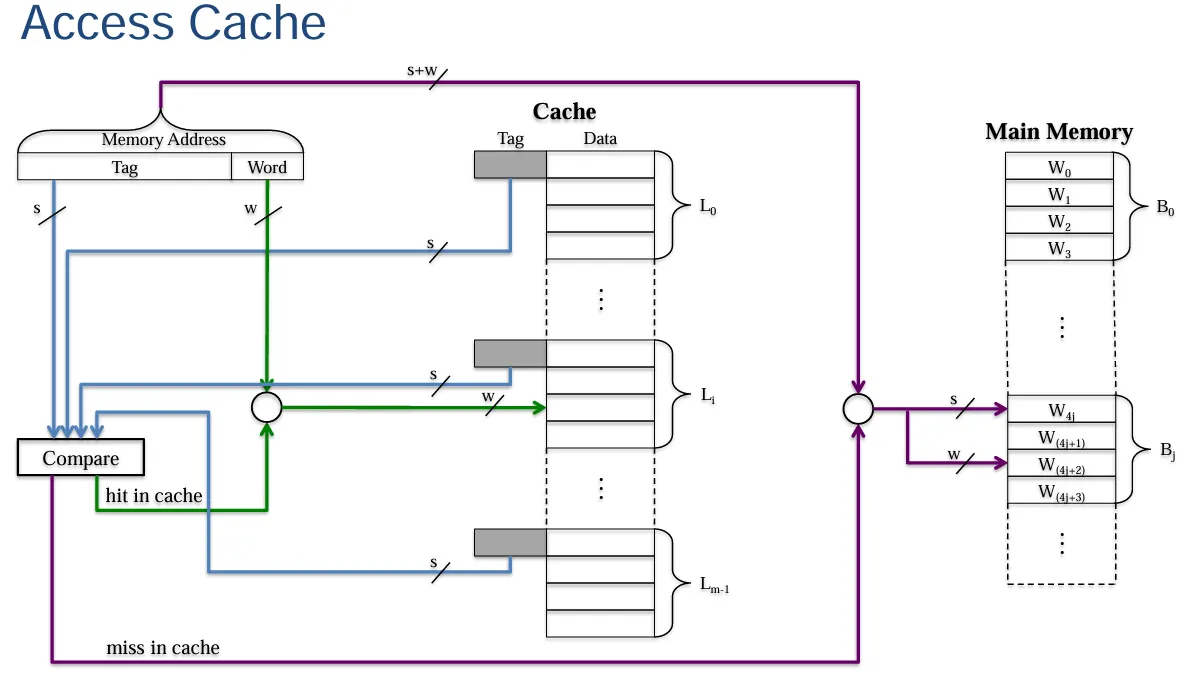- 主存地址结构:主存地址被解读为标记(Tag)和字(Word)两部分。其中,标记部分占\(s\)位,字部分占\(w\)位,标记能够唯一地标识主存中的数据块。在查找数据时,需要对高速缓存每一行的标记进行检查,看是否与之匹配,不过这样一来,高速缓存的查找操作在硬件实现上成本就比较高了。