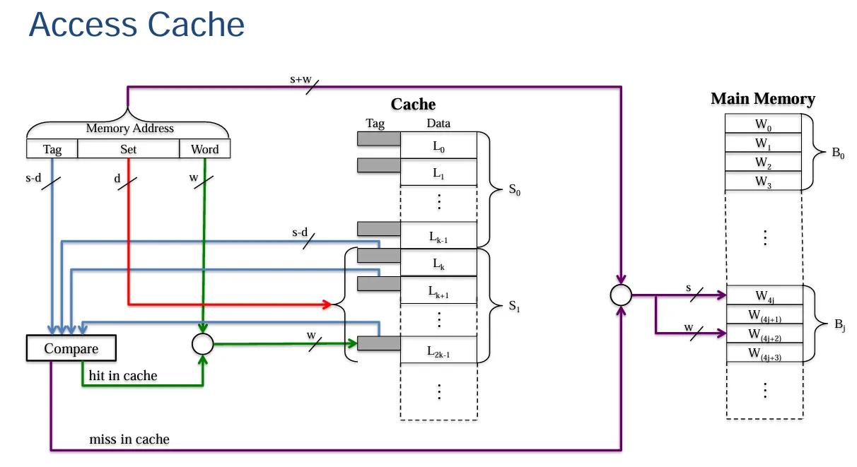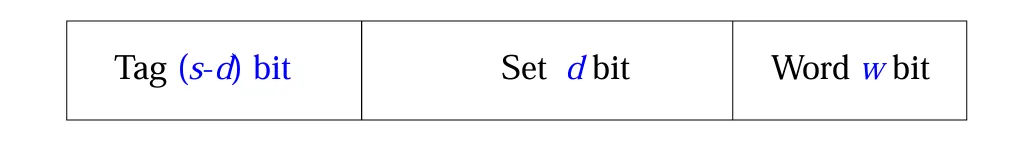 - 主存储器地址是由\(s + w\)位来表示的。 (\(s\)确定是哪一块内存块,\(w\)确定是哪一个字)。